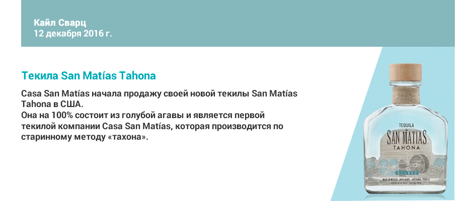 Наш новый продукт – это воплощение 130-летнего опыта в производстве текилы. Мы надеемся, что с каждым глотком San Matías Tahona вы сможете прочувствовать более чем вековую традицию, воплощенную в изысканной мексиканской текиле, и разделите эту радость со своими друзьями, родственниками и клиентами.